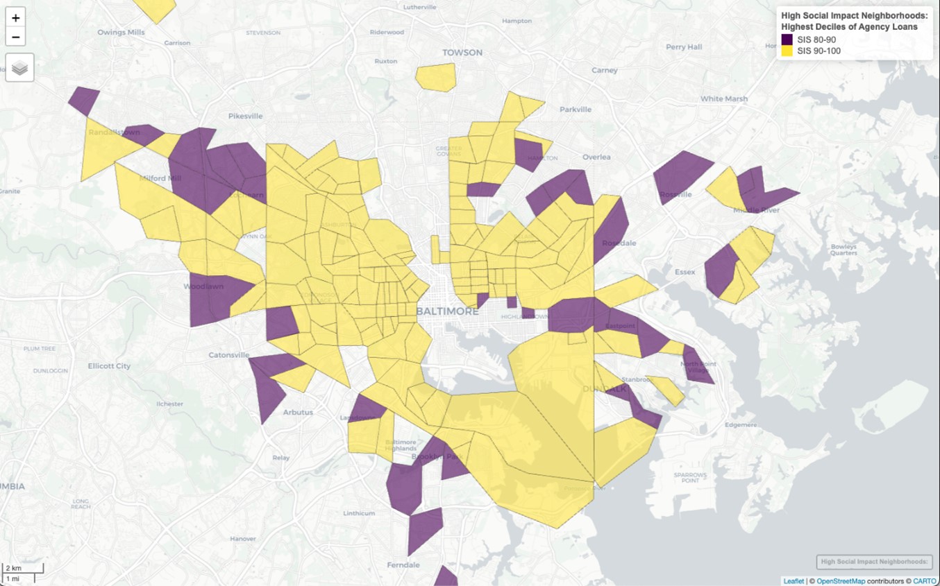Using all of the tools at our disposal, we are able to target our mortgage investments toward communities likely to have the highest social need. As an example, the map below shows the city of Baltimore's various census tracts, with the yellow and purple shading indicating areas with higher social impact scores where investment may have the greatest positive outcomes on the community. At a high level, our analysis is based around the goal of identifying and evaluating investable mortgage pools for their overlap with similar neighborhood characteristics to those highlighted in the map. While personal privacy concerns prevent us from conducting our analysis below the census tract level, the work done by ICE Sustainable Finance provides significant information around the broader community that does give us a unique perspective into the communities and borrowers we are supporting through our investments.