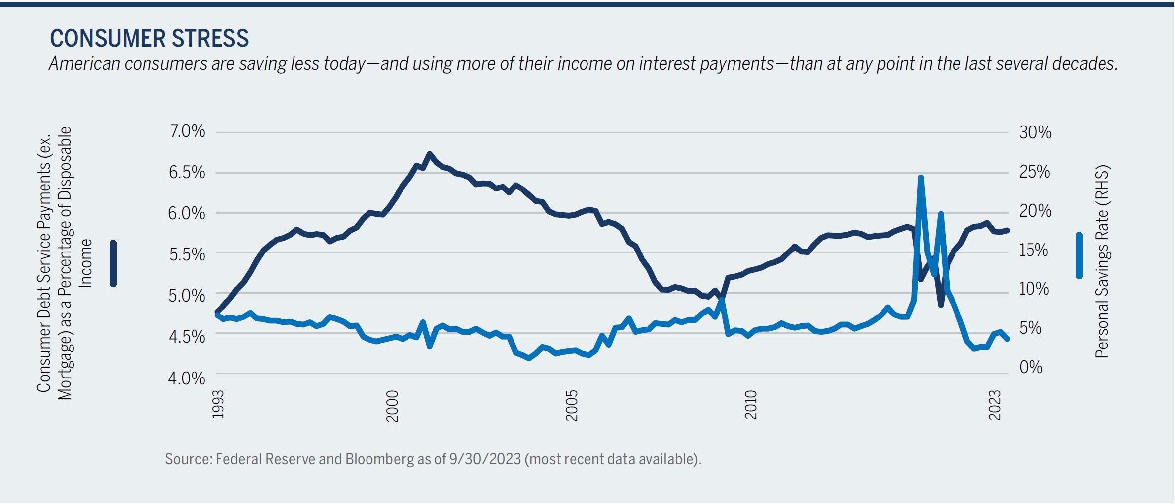 It is only a matter of time before these effects are felt in a more material way. Consumers are saving less today—and using more of their income to service their debts—than they have in 15 years (see chart below). Credit card and auto loan delinquency has started to rise, reaching pre-pandemic levels. Companies are starting to mention the impact of higher rates on consumer demand. All of this is starting to show up in reduced forward earnings guidance for some companies.