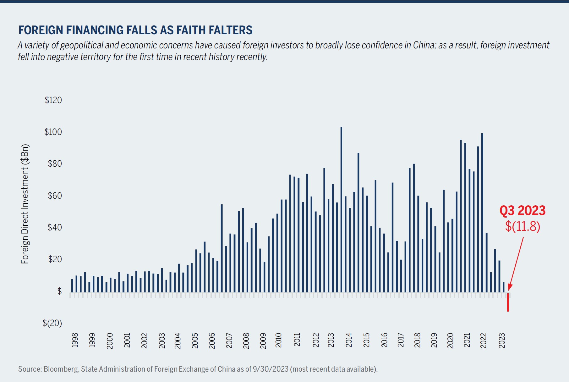 Asia: We had a number of our research team members travel to Asia this year, in hope of gaining insight into China’s recovery falling short of expectations, as well as Japan’s markets surprising many with their renewed vigor. We remain convinced that China still merits investor attention, with a plethora of quality growth companies, market inefficiency that rewards solid fundamental research and low valuation relative to its own history. However, these positives are being overshadowed by the growing uncertainty of the government’s ongoing support of free markets, China’s looming real estate debt woes, and the country’s highly challenging demographics. The demographic situation is more dire than many realize; China’s birth rate has dropped by 40% since the start of the pandemic, and recent estimates suggest its working-age population may decline by 20% in the next 20 years—a potentially MASSIVE drop in overall production (equivalent to ~40 million workers leaving the U.S. workforce over a similar timeframe). Meanwhile, Xi Jinping’s consolidation of power and the Party’s various steps to retreat from market-oriented capitalism have undermined business and investor confidence and pushed foreign direct investment into negative territory for the first time on record (see chart below).