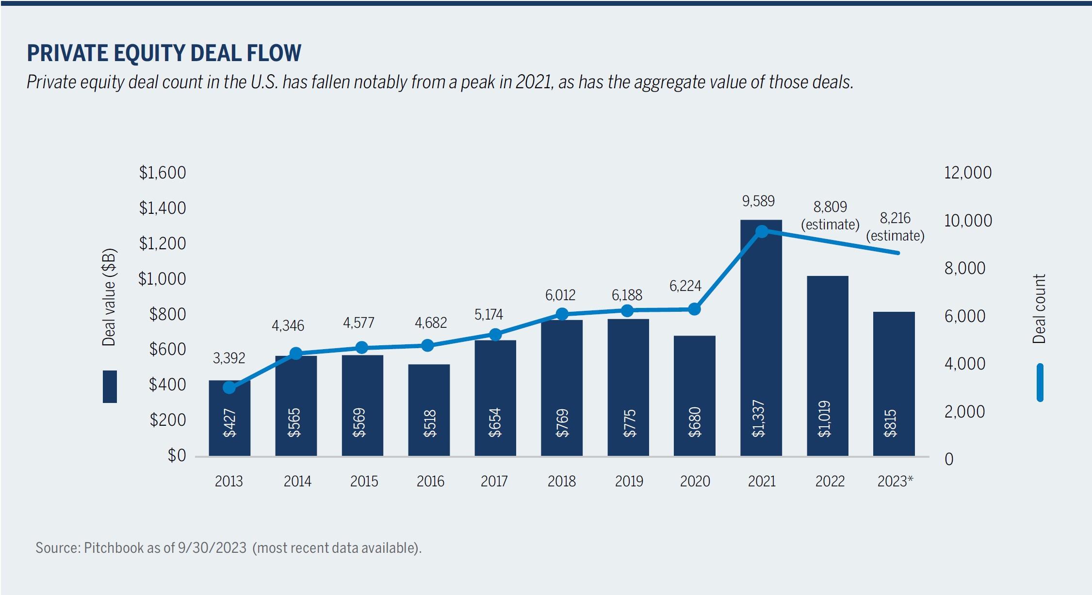 Regardless of the sector, we remain highly aligned with our top managers, and are broadly resisting the instinct to indiscriminately cut back on allocations. Private equity deal activity slowed yet again in 2023, with most investors pulling back. Investors have been rewarded over time for leaning in during periods like this, especially with managers that have demonstrated their skill across full market cycles. Of course, all private investments need to be weighed against each investor’s risk profile and circumstances, particularly in tougher market conditions.