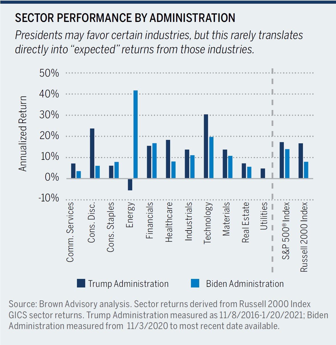 For example, in the chart below, we summarize average results over the past century, and then offer the same summary excluding the outlier results of 2008. You will see that without the market results from the 2008-09 credit crisis, the data now “suggests” that election years offer notably higher returns, and the results are equal when Democrats and Republicans win. Further, we can see that “expected” sector returns under Republicans and Democrats do not always fit expectations (see chart on page 10); for example, a “political investor” likely would have chosen to invest in the energy sector under Trump and not under Biden, which would have led them to a weaker return. We believe that it would be foolhardy to draw investment conclusions about election years using the very noisy historical data available to us.