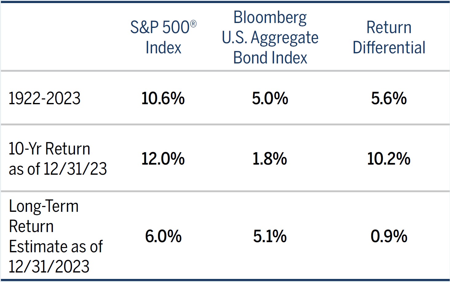 Historically, stocks and bonds have both offered desirable, risk-adjusted returns, with stocks offering a greater return. Over the past decade or so, this “truism” became untrue, as bond returns plummeted to less than 2%. However, with higher interest rates, we anticipate bonds will likely produce a more competitive return compared to equities going forward.