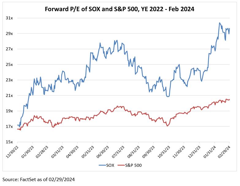 Typically, a cyclical sector would experience multiple expansion during a recessionary period and multiple contraction during a period of prosperity, with the expectation that conditions will simply shift from boom to bust, and back again. The current valuation backdrop for the semi subsector (SOX trades at 30x P/E versus S&P 500 Index at 20x) likely suggests an expectation of not only a cyclical recovery in non-AI related markets but strong secular growth in AI-related revenue for many years to come.