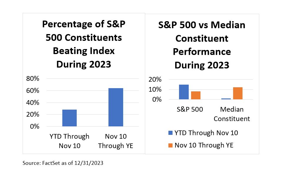 The final seven weeks of 2023, however, told a different story. During the last part of the year, nearly two-thirds of S&P 500® Index constituents beat the Index, compared to fewer than 30% during the first 45 weeks of the year. Additionally, over the final 33 trading days of 2023, the median S&P 500 Index constituent gained more than 12%; during the first 219 trading days, the median performer gained less than 1%.