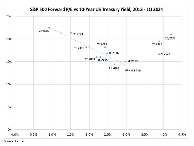 However, something structurally changed by YE 2022 – the market multiple was above 16.5x, a similar level to YE 2016, yet the 10-year yield was about 150 bps higher. By YE 2023, the 10-year yield was the same as it had been 12 months prior, yet the market multiple increased by three times to more than 19.5x. By the end of 1q 2024 the Index fell even further from the historically defined relationship.