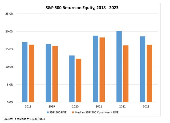 According to FactSet, there has been a step-change improvement in the S&P 500® Index’s ROE in recent years relative to levels pre-pandemic. However, when taking the median ROE of all of the Index’s constituents over these years it is inconclusive whether ROE has actually improved for the underlying set of companies. The explanation for the difference likely lies in the increased weighting of the largest companies in the index – such as Apple (AAPL), Microsoft (MSFT), NVIDIA (NVDA), Alphabet (GOOG) and META Platforms (META) – all of which carry above-median ROEs.