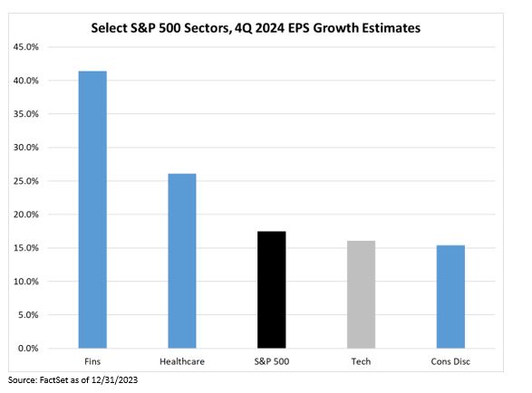The expected EPS growth rate has also risen for the S&P 500® Index. According to FactSet, from 2012-2023 the Index’s EPS CAGR was a modest 6.9%. For 2024 and 2025, consensus estimates are calling for EPS growth of 10.7% and 13.3% respectively. An acceleration in growth is expected to occur later this year; 1q 2024 EPS growth is anticipated at below 3%, the middle two quarters are expected to show 8-9% growth, while by 4q, the growth rate is expected to explode to 17.5%! By the final quarter of the year, all major economic sectors are expected to show very strong year-over-year EPS growth, suggesting a broad recovery in fundamentals.