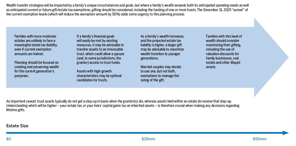 Estate Planning: One important issue involves how to plan around the current augmented estate and gift tax exemption ($10 million indexed for inflation, or twice that amount for a married couple). Adjusted for inflation, a married couple currently may give away up to $25.84 million (or leave that amount to their heirs) without gift or estate tax liability, but under current law, that limit will be reduced by half at the end of 2025. Many families will want to take advantage of the current exemption levels with meaningful gifts, but there are trade-offs, including giving up a stepped-up tax basis at death and the irrevocability of the transfer, so these decisions need to be undertaken with careful deliberation. Because such gifting often involves trusts, family business entities and other complex structures, discussions and planning should begin during 2024—well in advance of the “sunset” deadline. A framework for this planning is contained in the chart below.