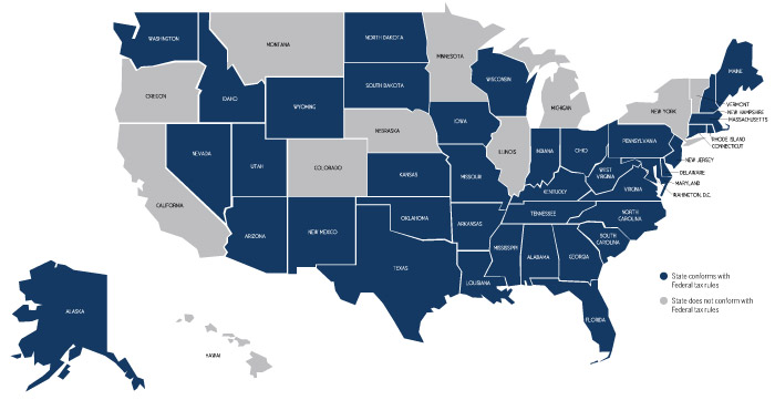 As it stands today, 31 states1 conform to the federal tax code on 529 plans (see graphic). These states either exempt K-12 distributions from state taxes up to the $10,000 limit, or do not impose any state income tax (in which case the issue is not relevant).