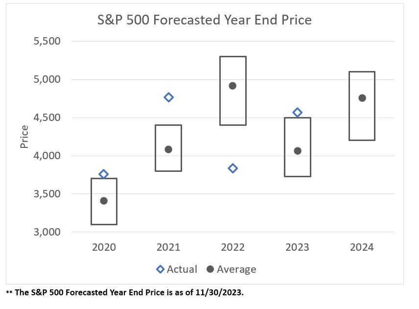 As we approach the end of 2023, it’s once again the season for festive decorations, office holiday parties…and Wall Street forecasts for the S&P 500 Index for the next calendar year. While Munger would certainly have suggested avoiding crazy behavior at year-end celebrations, he might also have questioned the rationality of annual market prognostications that garner such close attention of investors and news outlets. Publishing a single point estimate that attempts to account for so many anticipated and even more unforeseen events that impact equity prices over a 12-month period goes in the “too hard” bucket in my opinion.