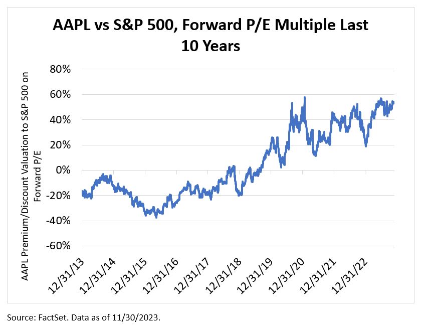 Apple (AAPL), the largest company by market cap among the Magnificent Seven (recently eclipsing $3 trillion in market value), has experienced nearly 40% P/E multiple expansion during 2023 (trading at 29x forward as of end November). The median change in P/E for all S&P 500 Index constituents this year is slightly negative. The stock trades at more than a 50% premium to the broader market on forward P/E, versus an average premium of just 4% over the past ten years. Is the current level of premium valuation approaching “crazy”? Ironically, AAPL is Berkshire Hathaway’s largest stock position by far, valued at about $175 billion. Sadly, it’s too late to ask Munger for his thoughts on the topic.