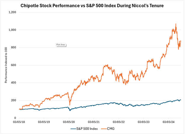 Furthering Mick’s point let’s look at another high-profile corporate executive. Brian Niccol became CEO of Starbucks (SBUX) effective September 2024. In his prior role as CEO of Chipotle (2018-2024), Niccol inherited a business in crisis following a series of foodborne illness outbreaks. During his tenure, the company’s reputation and fundamental performance was restored, while Chipotle’s market cap climbed from below $10 billion to nearly $80 billion. Over the same time frame, the S&P 500® Index doubled.