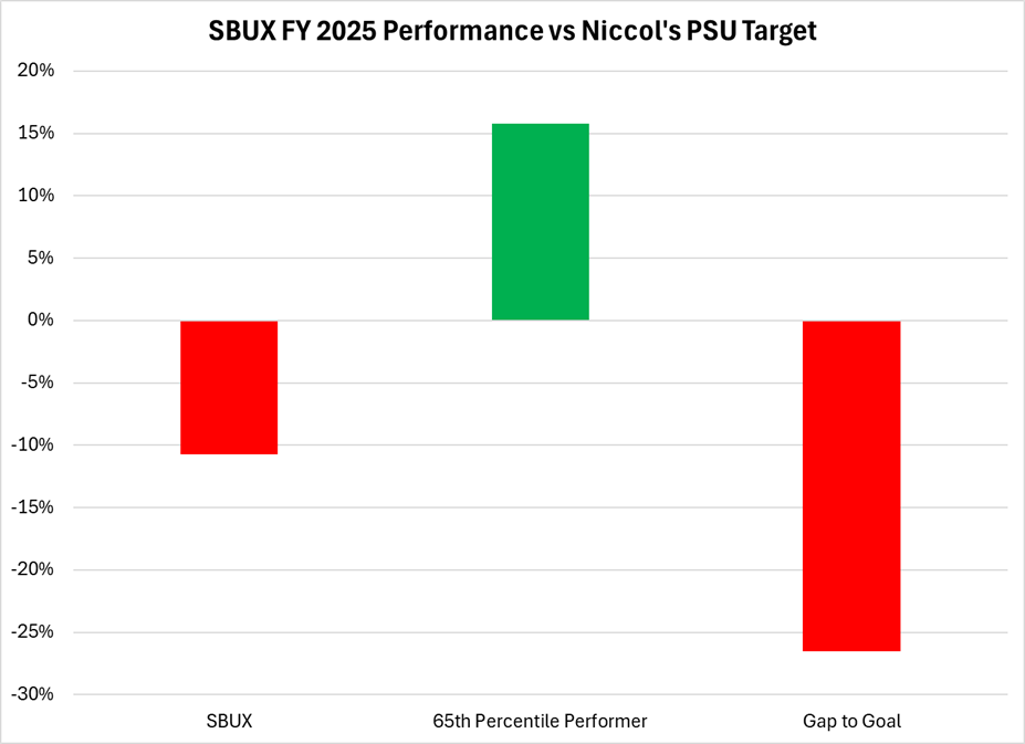 Clearly, Niccol came to Starbucks with a phenomenal pedigree like our pitching protagonist, Mr. Yamamoto. And like the 2025 World Series MVP, there was considerable initial criticism about his pay package. The headlines last year focused on Niccol’s $95.8 million compensation and the eye-popping 6,666:1 CEO pay ratio at Starbucks that year. However, the headlines may have missed the nuances. Nearly the entirety of his fiscal year 2024 compensation ($90 million of the $96 million) relates to “replacement awards” that account for unvested equity and incentives Niccol forfeited when leaving Chipotle. In addition, 60% of the replacement award value is in the form of Performance Stock Units (PSUs) that require SBUX to outperform roughly two-thirds of S&P 500 Index companies over a three-year period. The minority of the replacement awards are in the form of time-vested Restricted Stock Units (RSUs) that are not tied to specific performance targets. During the company’s fiscal year 2025 ending in September, SBUX finished in the bottom third of all S&P 500 Index constituents. In other words, SBUX needs to substantially outperform its large cap peers over the next two years for Niccol to be “made whole” for leaving Chipotle. That seems like good motivation for the Starbucks CEO and an alignment with shareholder interests to me.