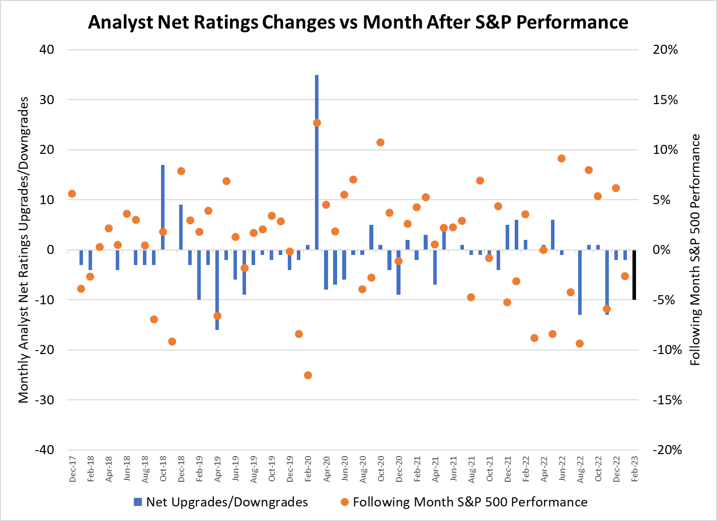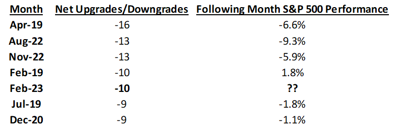 Last month, our analyst team downgraded 15 stocks while upgrading only five. This ties for the fourth greatest negative monthly differential between upgrades and downgrades (-10) since the end of 2017. As you see in the table below, the analyst team has been very good tactically – the market has been particularly ugly in the month following our most bearish changes in ratings. If equity markets are in the red in March, we'll know why.