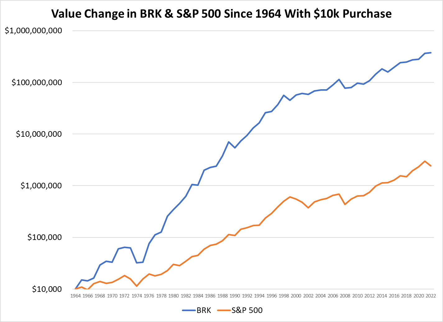 This isn’t monopoly money, folks. Your initial $10,000 in Berkshire stock in 1964 (purchasing power of about $100,000 today) would now be worth a very cool $377.8 million (before taxes paid on gains). That’s how insane the power of compounding is over a very long period of time. The chart uses a logarithmic scale because the $2.4 million one would have earned after investing in the S&P 500 Index would otherwise not even be visible in comparison with Berkshire.