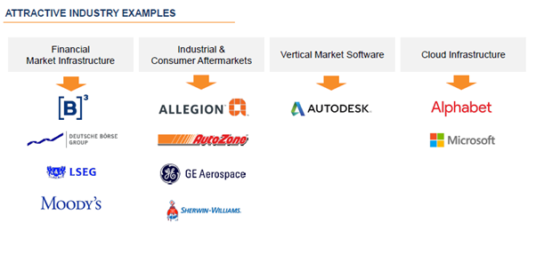 Over time, Mick and Bertie have identified certain areas that host a number of companies with the quality business characteristics they admire. These include financial market infrastructure, such as stock exchanges and data businesses that support financial decision-making; industrials and consumer aftermarkets – companies that boast a strong consumer surplus; and in the technology sector, they favour vertical market software companies and also cloud infrastructure businesses, which benefit from the explosion in data as well as the growth in artificial intelligence.