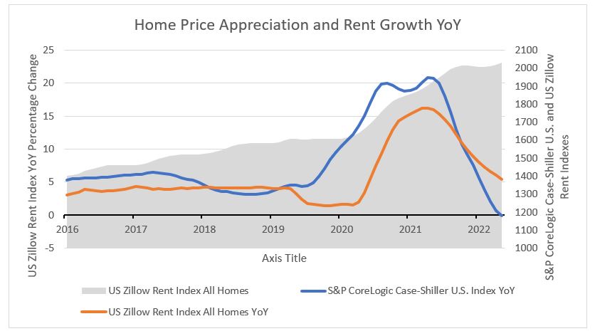 US Zillow Rent Index (ZORI): A smoothed measure of the typical observed market rate rent across a given region. ZORI is a repeat rent index that is weighted to the rental housing stock to ensure representativeness across the entire market, not just those homes currently listed for rent. The index is dollar-denominated by computing the mean of listed rents that fall into the 40th to 60th percentile range for all homes and apartments in a given region, which is once again weighted to reflect the rental housing stock.