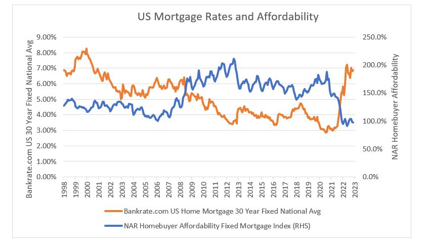 It is difficult for investors and individuals alike not to have been directly impacted by the rapid rise in inflation in 2021 and 2022, the succeeding interest rate hikes by global central banks and the ensuing effects these economic events have had on financial markets, including the mortgage market. The 30-year fixed mortgage rate in the U.S. more than doubled in 2022, climbing from 3.27% on 12/30/21 to 6.66% on 12/29/22 according to the Freddie Mac Primary Mortgage Market Survey (PMMS). This rate environment has led to a drastic decline in affordability for homebuyers. The chart below illustrates this predicament, with home affordability for a typical buyer hitting its lowest point since the start of the index in 1989.